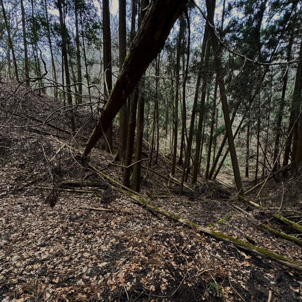 未整備の森は、倒木と急斜面が行く手を阻む。