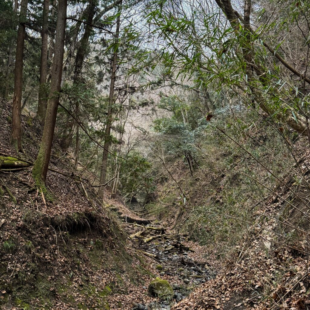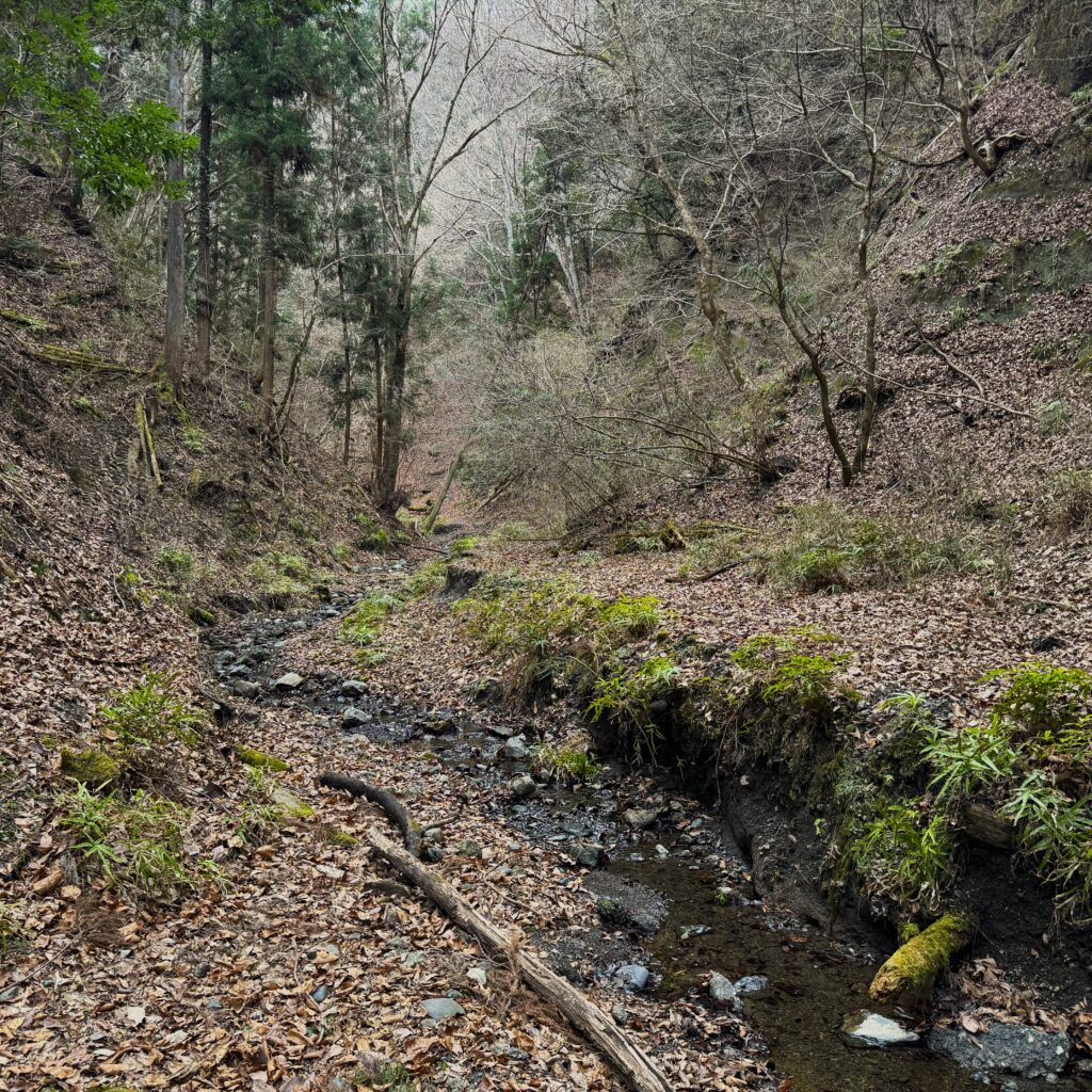 ぬかるんだ地形を抜け、地形の変化を追いながら、細道の先に小さな沢を発見した。